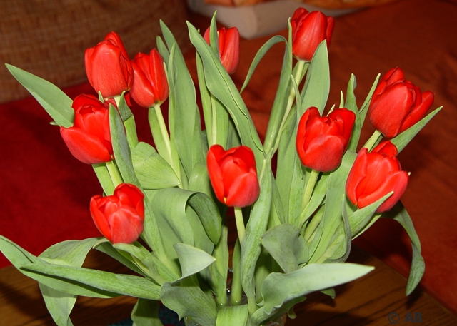 Mich dürstet nach Farben. Diese ewige grau und weiß der letzten Zeit macht einen ja depressiv. Daher habe ich diese schönen knallroten Tulpen, die mich gestern beim Einkauf anlachten, einfach mitgenommen. Eine ebenso knallrote Amaryllis habe ich mir unverschämterweise auch noch gegönnt – aber die ist noch geschlossen. Bin gespannt wie die Blüte nachher aussieht.